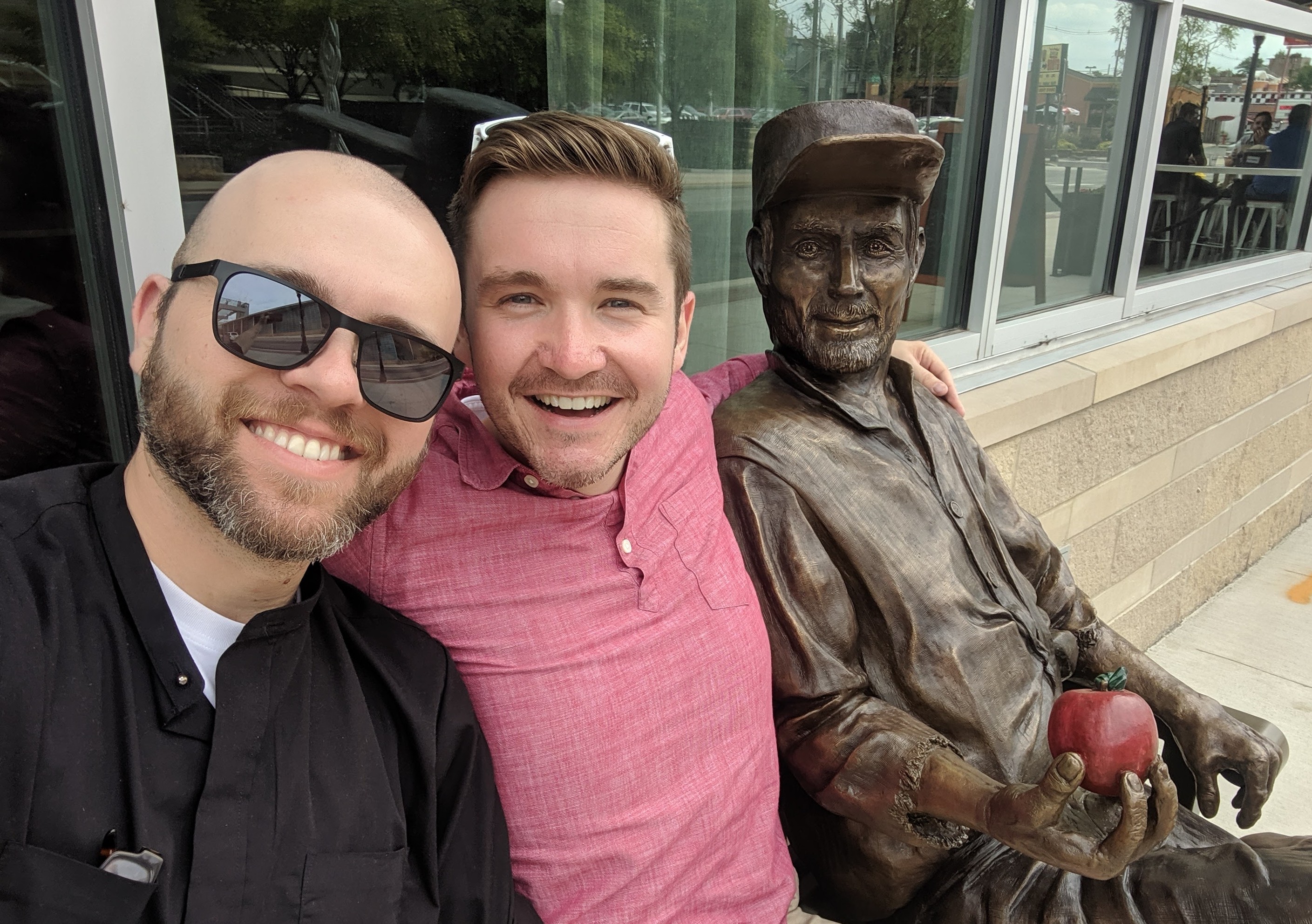 But hopefully he’ll be fine with it, because the very first picture that Matt and I ever took together, the first documentation of our relationship, right after we met, is a selfie of us sitting on a bench with a statue of Johnny Appleseed. So he has a very special place in our personal history, too!